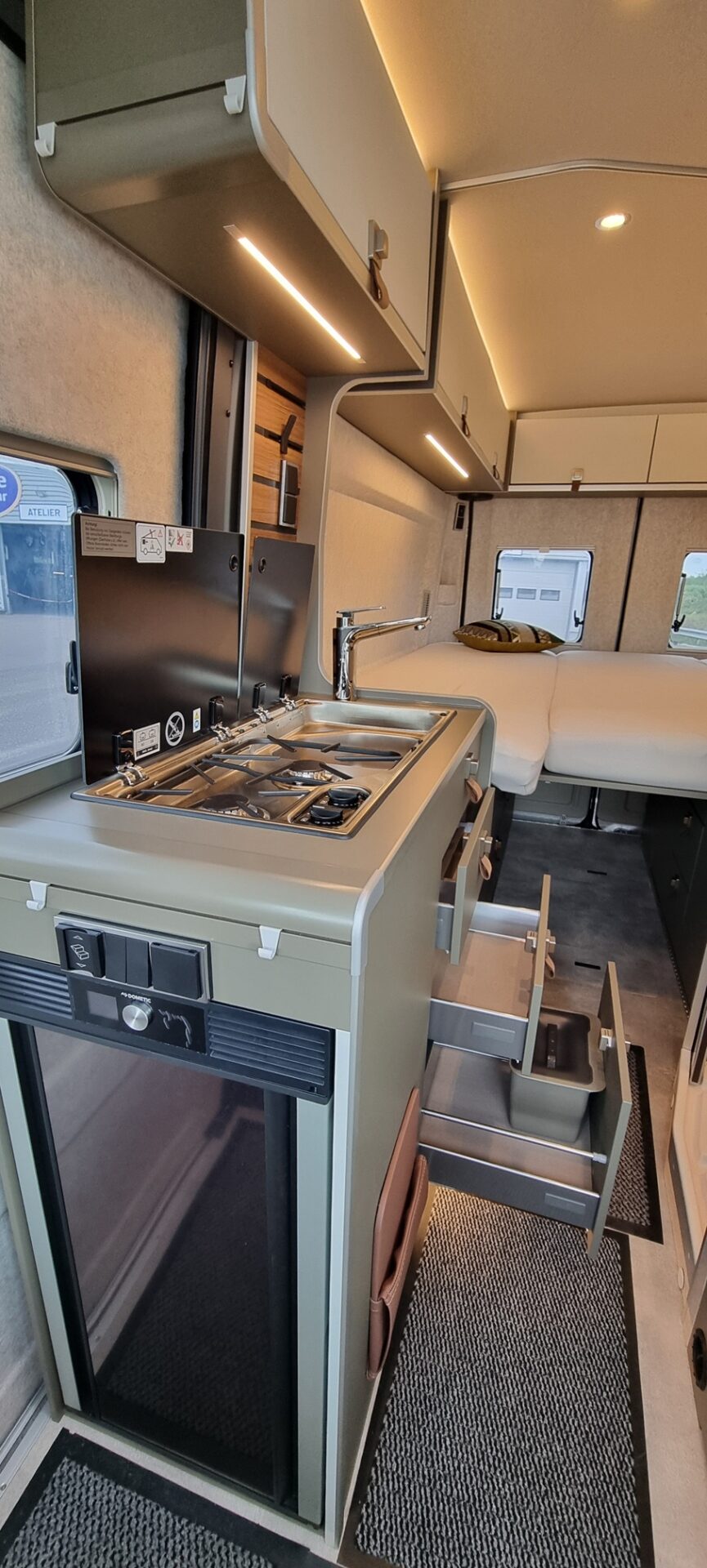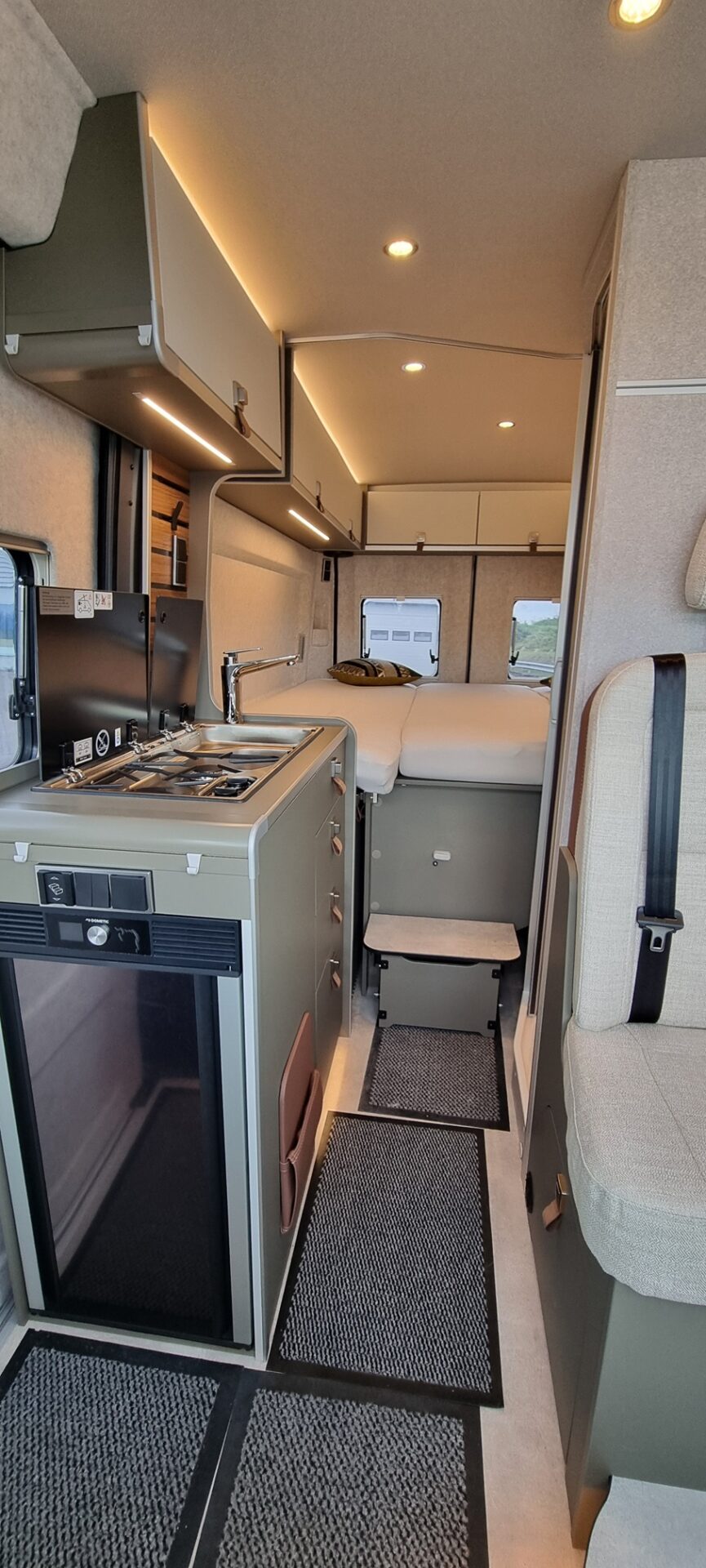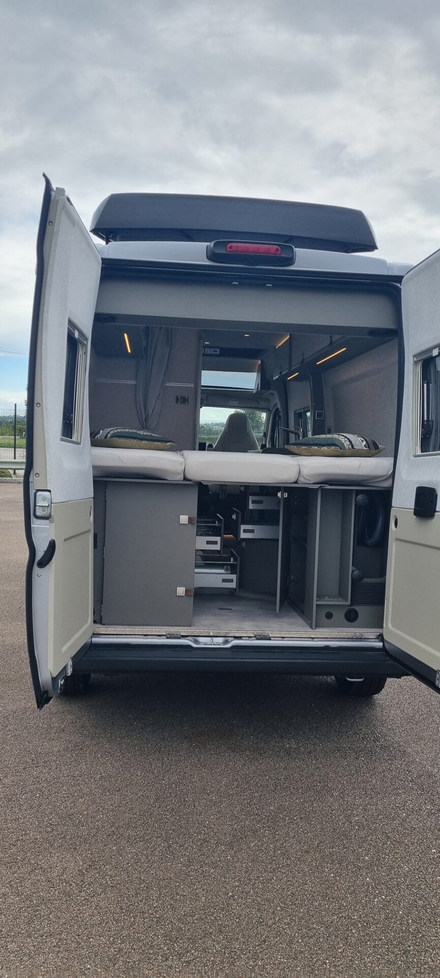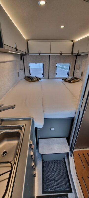 • Pack Confort Cellule : Skyview avec store occultant, Système d’éclairage d’ambiance : système d’éclairage à plusieurs niveaux avec commande dynamique et individuelle (y compris l’intensité de la lumière) ainsi qu’un balisage au sol, Ambiance style “HOME” (2 coussins houssés + pochette de rangement en tissu), Draps-housses sur mesure pour lits arrière adaptés aux contours du matelas, Caillebotis de douche avec surface en liège : 1 665 €